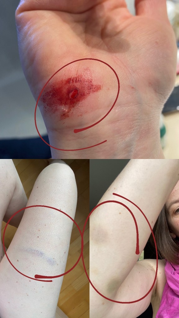 Both occasions were because of water and the incessant rain. The first fall was less traumatic than it sounds- I literally slid gracefully to the cement floor in the cellar/garage space here at home. I landed on my ass and felt a little like a fool, and it was more comical than anything else.